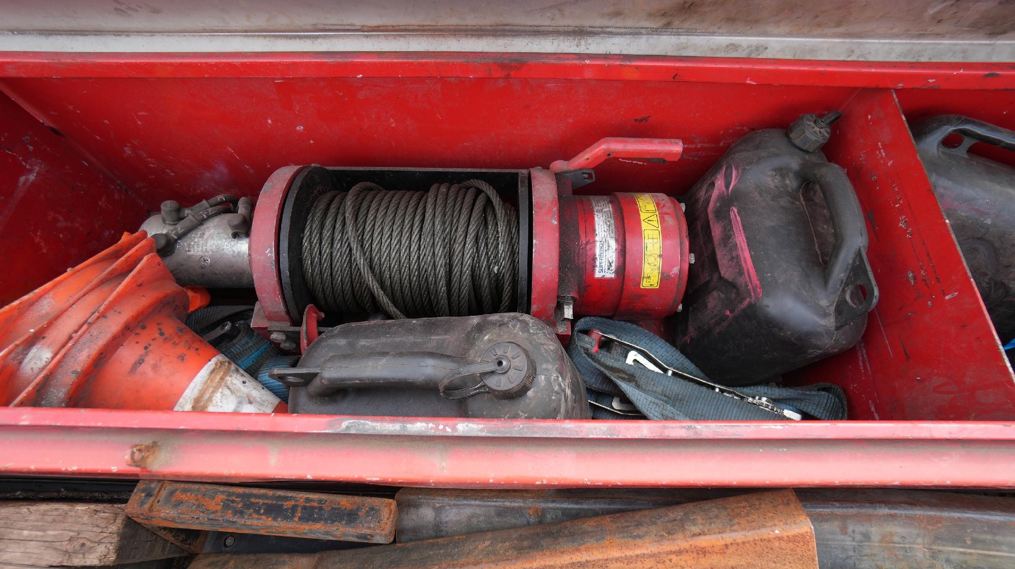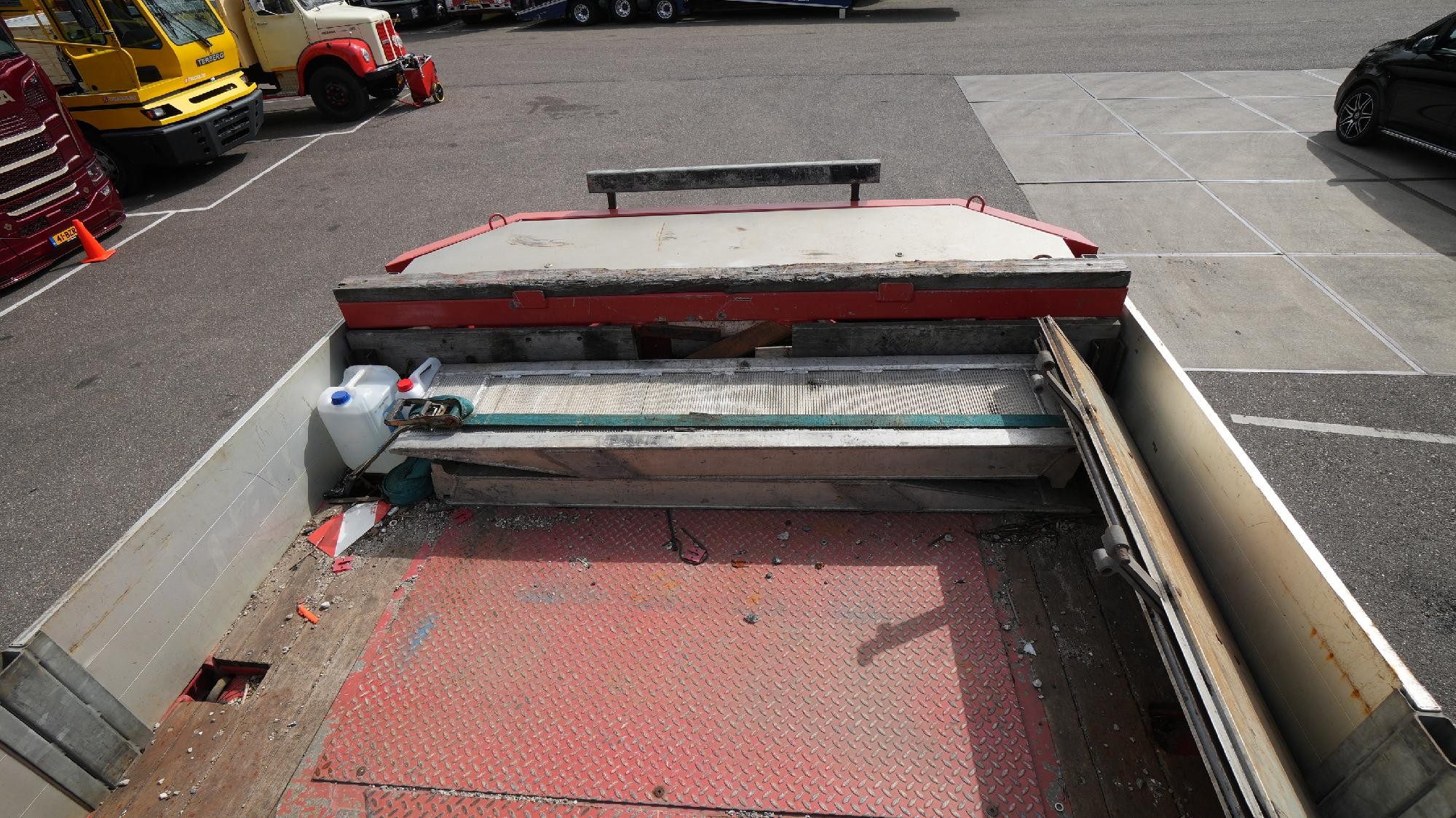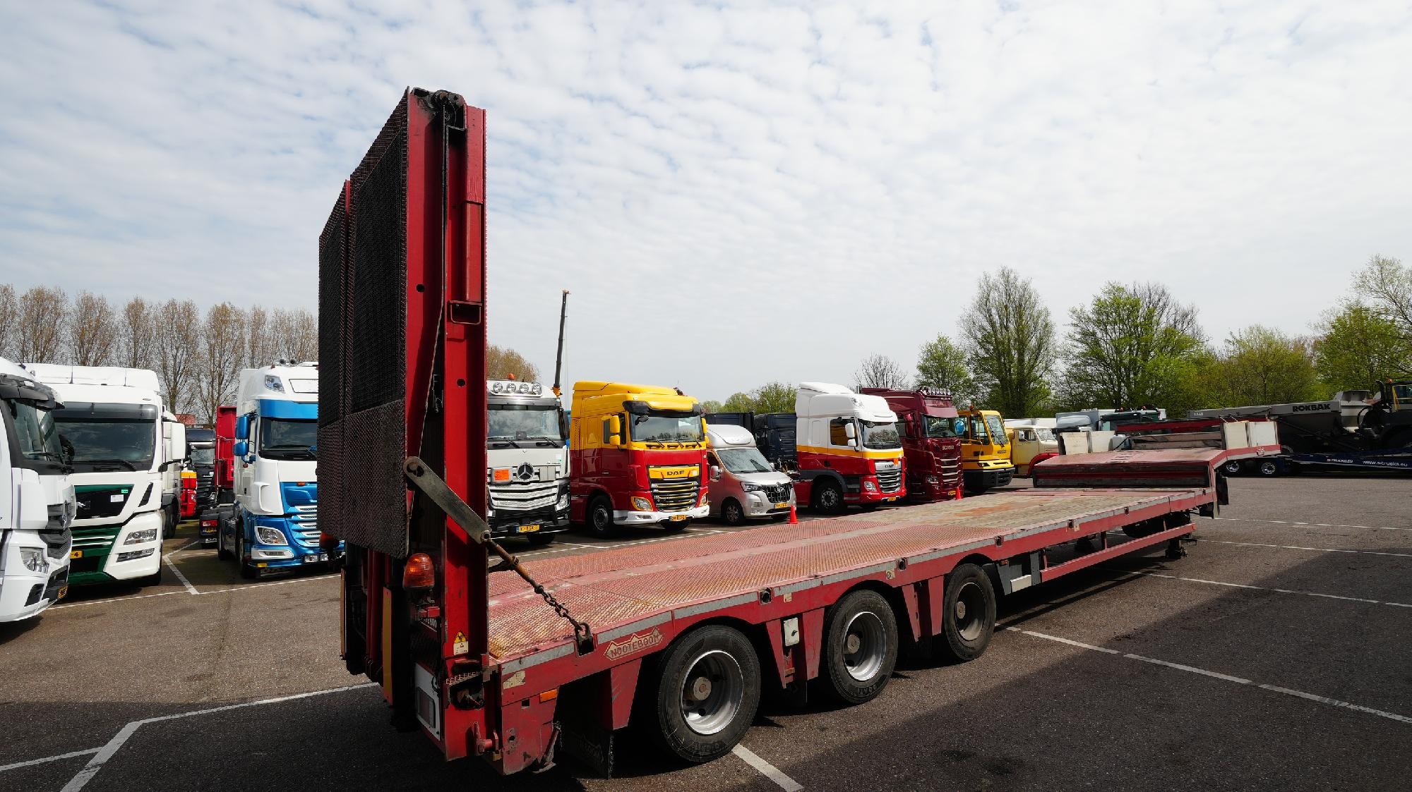 Equipped with ABS, air suspension, winch, drum brakes, 3x SAF axles and 3x steering axles. Fitted with 2x hydraulic ramps and aluminium loading ramps for driving onto the neck.
